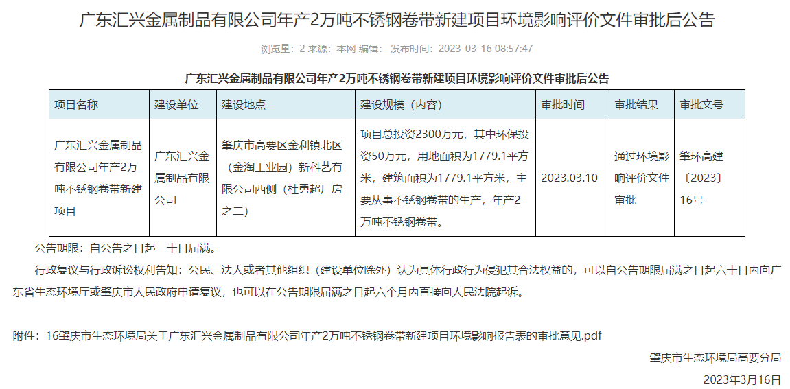3月16日,肇慶市生態(tài)環(huán)境局高要分局就東匯興金屬制品有限公司年產(chǎn)2萬噸不銹鋼卷帶新建項目環(huán)境影響報告表作出審批意見并對外進(jìn)行公告,公告期限:自公告之日起三十日屆滿。
