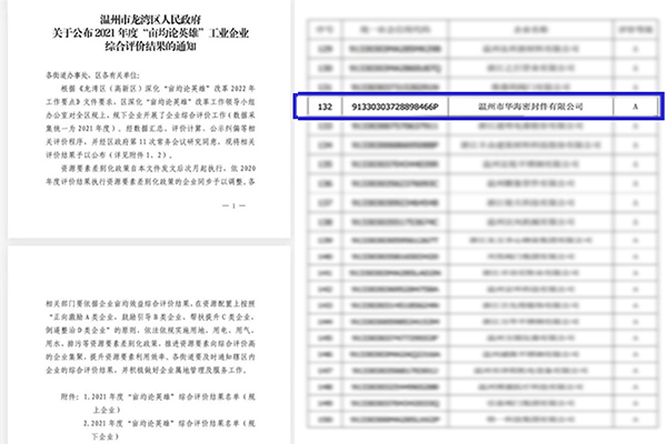 近日,溫州市龍灣區(qū)人民政府公布2021年龍灣區(qū)(高新區(qū))“畝產(chǎn)論英雄”工業(yè)企業(yè)綜合評(píng)價(jià)結(jié)果,溫州市華海密封件有限公司被評(píng)為A類企業(yè)。